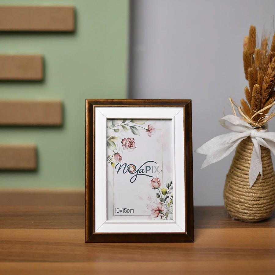 10×15 cm fotoğraflar için uygun, kahverengi dış çerçeveli ve beyaz iç detaylı sade masa üstü fotoğraf çerçevesi.